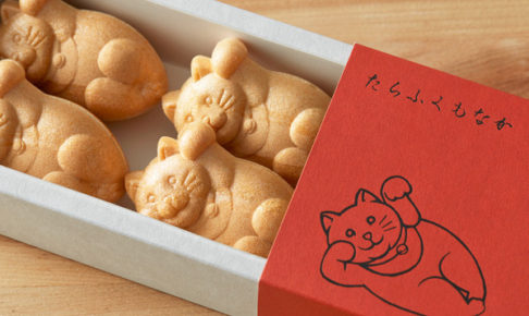 寝そべっている招き猫が、かわいすぎる「たらふくもなか」。テレビドラマにも登場した知る人ぞ知る和菓子で、地元の方からも愛され続けている商品です。餡には「白いダイヤ」と呼ばれる北海道産の白小豆を使用。あっさりしているのに、コク深い風味を楽しめます。またパッケージにも寝そべった招き猫が描かれており、とってもキュート♪もらった方も思わず笑顔になる、おすすめの帰省土産です。