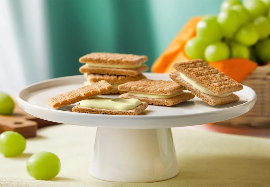 注目すべきは、5種類の素材をブレンドして焼き上げた香ばしいシリアル生地にも国産シャインマスカットが使われている点です。袋を開けた瞬間から、芳醇な香りがふわりと広がるのが特徴。一口食べると、ザクッとした食感とともに、みずみずしくミルキーなシャインマスカットの風味が口いっぱいに広がります。