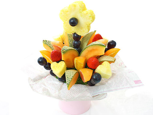 花束にみたてたフルーツアレンジメント。先端にはパイナップルのお花がついており、周りには国産メロンや旬の果物(オレンジ、グレープフルーツ、ぶどう、いちごなど)がアレンジされています。まるで植木鉢にさいたようなお花のアレンジメントは、ハレの日にぴったり。串にささっているので、カット不要。届いてすぐに食べることができます。